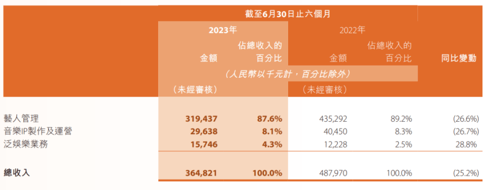 财报显示,在乐华娱乐的收入构成中,艺人管理业务为主要来源,主要来自艺人参演影视剧和电影、综艺节目和公开演出的商业收入,艺人担当商业代言、品牌推广活动和其他商业推广活动的收入。这些收入占到了2023年上半年收入构成的87.56%。