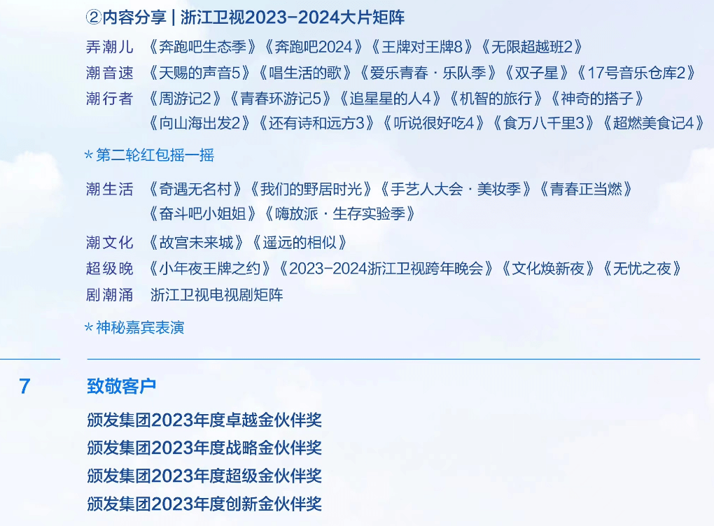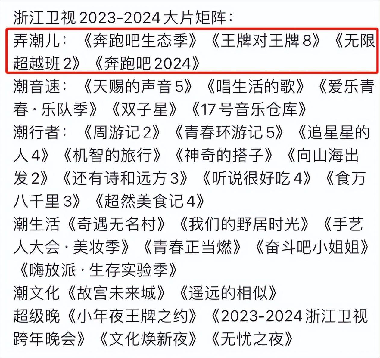 细看浙江卫视公布的最新招商片单,不难发现整个电视台在综艺节目方面吸引力愈发下降,全靠《奔跑吧》撑场,一个节目IP还要出现两次,全部摆在了最前排。