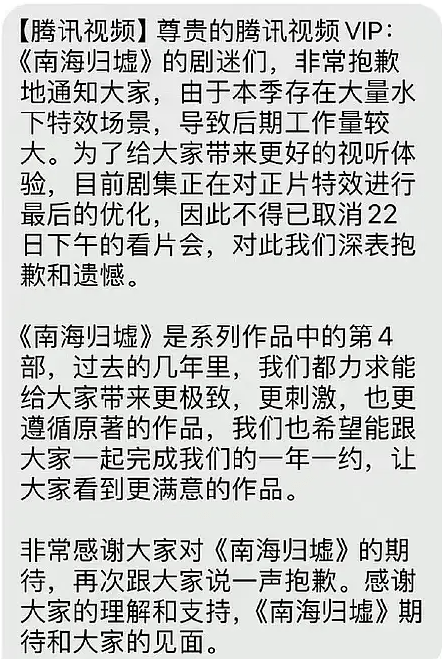 不过,在21日的夜间,不少剧迷收到了腾讯视频方面的短信内容。这份短信内容显示,因为《南海归墟》存在大量的水下特效戏份,需要优化,因此,原定22日下午看片会取消了。短信内容被网络曝光出来之后,很多剧迷陷入到了愤怒的状态。显然,这部可能在22日上线的电视剧作品,需要再次“撤档”了。