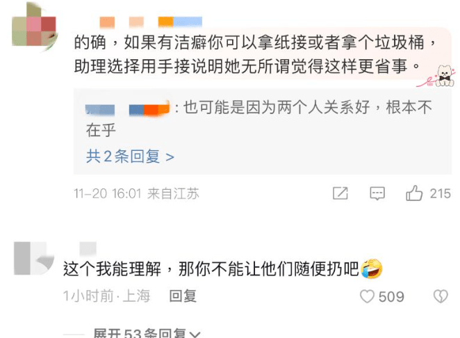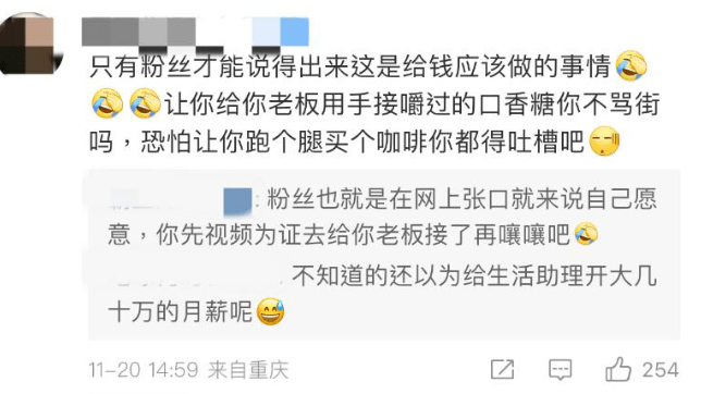赵露思的粉丝当然据理力争,称助理是赵露思多年好朋友,手接口香糖是心甘情愿的,还称就业是双向的,要是助理觉得委屈自己了可以不干这份工作,粉丝似乎觉得手接口香糖也是助理该做的事。