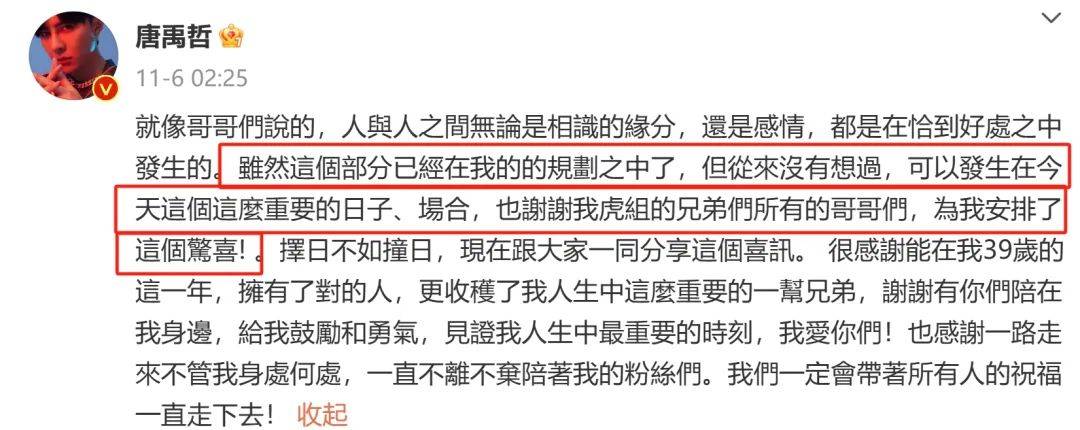披哥决赛那天,参与录制的粉丝发来repo,说唐禹哲在其他哥哥们的起哄下向女友求婚,用的还是林志颖的戒指,整个流程都没有事先彩排过。