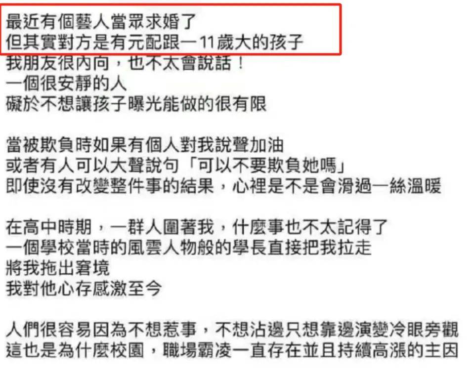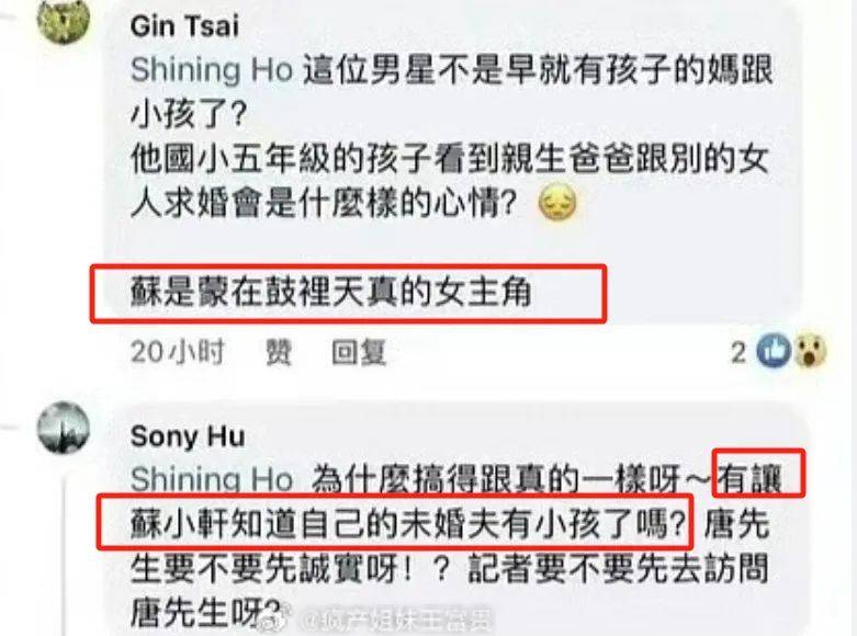 在他成功求婚苏小轩之后,外网有账号发文,疑似是替孩子妈妈抱不平,说“最近有个艺人当众求婚了,但其实对方是有原配跟一个11岁大的孩子”↓↓