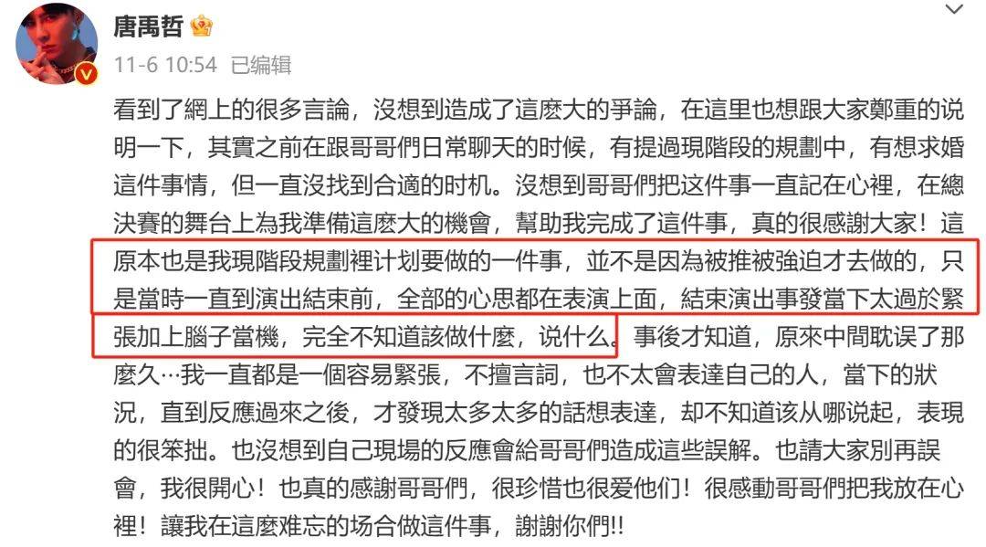 虽然事后唐禹哲两次回应“求婚在计划内,只是没想到发生在今天”,还特意强调很开心兄弟们给自己安排的求婚惊喜,但是他从始至终没有提到最应该出现的女主角,于是又一次被观众臭骂。