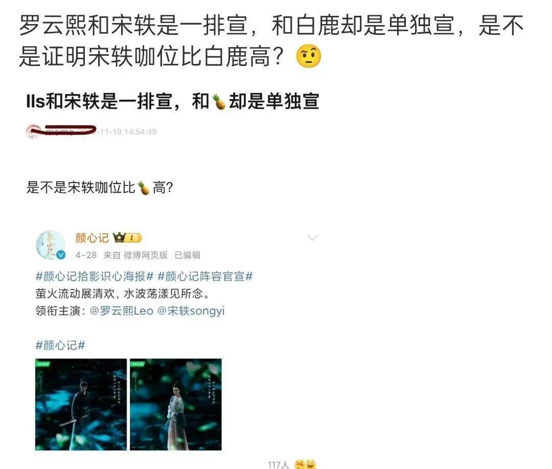 有网友翻出《颜心记》和《长月烬明》的演员阵容官宣博,发现同为男女主且男方一番,但罗云熙和宋轶官宣时是在同一行,但罗云熙和白鹿官宣时却是艺人一条动态单独宣,被不少人猜测是暗戳戳证明了业内普遍更认可宋轶的咖位高一等的说法...