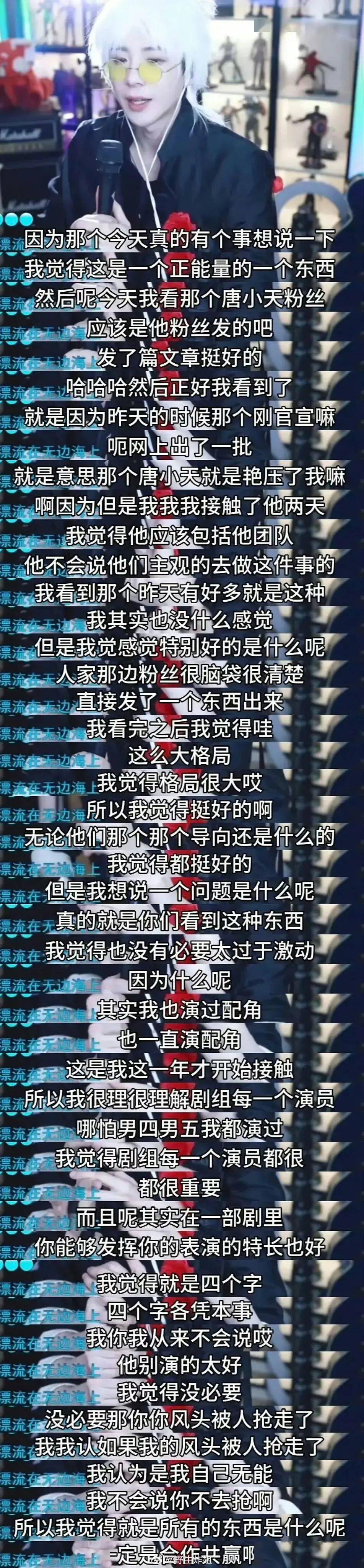 很快双方粉丝开启了新一轮掰头,男主粉丝都在质疑是唐晓天团队下场引导控评,刘宇宁在直播时看到有网友cue这个话题,也正面发声称相信拉踩贴不是男二团队发的,自己也是从配角一路演过来才有主角戏,不管男几号只要发挥专长大家凭本事吸粉,言外之意就是不在乎被艳压与否会和男二“公平竞争”靠演技说话。