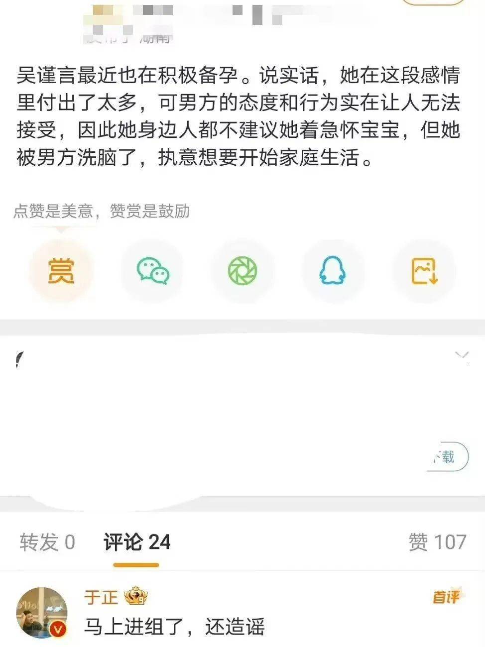 最近又有瓜主联合实际爆料吴谨言因恋爱脑太过严重,即使身边人都劝她不要投入太深,还毅然决然积极备孕打算靠孩子捆绑和男友的恋情,不过这则八卦很快就被10G冲浪的于正刷到,直接下场辟谣透露吴谨言很快就要进组。