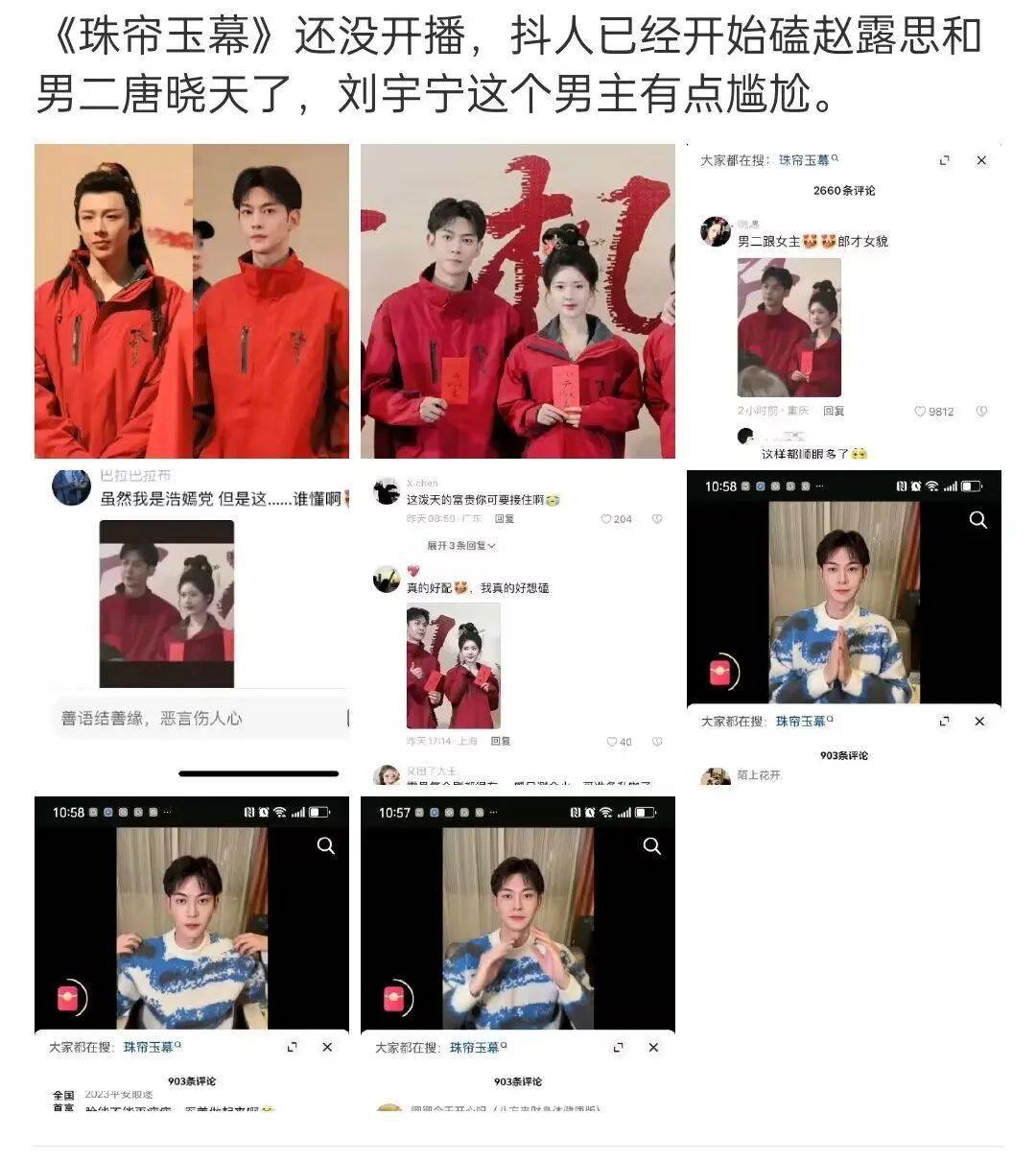 靠粉丝互撕方式前期“备受瞩目”的古偶《珠帘玉幕》终于正式官宣开机,网上还流出了一组开机现场路透,不过相较于磕赵露思刘宇宁二搭的cp粉以外,网上却出现了更多数量的男二唐晓天艳压贴,主要内容都是男主男二站一起的对比图,吐槽刘宇宁作为素人都只能算一般不明白他为什么能有这么好的资源,站队唐晓天和赵露思会更有bg感,压宝唐晓天会火抢男主风头之类的。