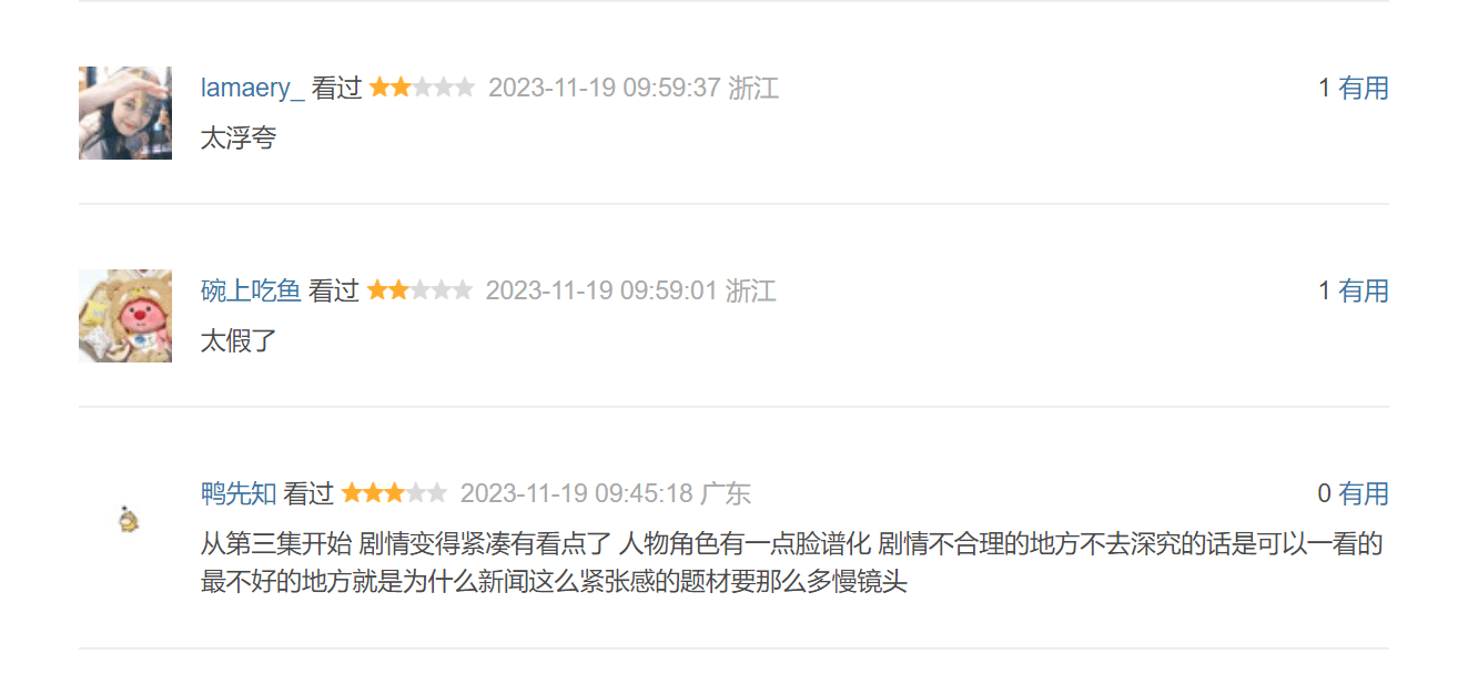 翻看最新评论,也是差评为主,有看起来像从事新闻工作的网友吐槽电视剧“细节浮夸不真实,场景与事故等级不符,主播的语速和仪态都不对…剧情角色方面,冲突和人物刻画都太刻意了。”当然也不乏有相对理性的观众,表示从第三集开始,剧情变得紧凑有看点了,人物角色有一点脸谱化,剧情不合理的地方不去深究的话是可以一看。