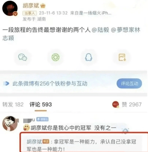 胡彦斌发文感谢过陆毅和林志颖后,又在评论区提起了冠军一事。