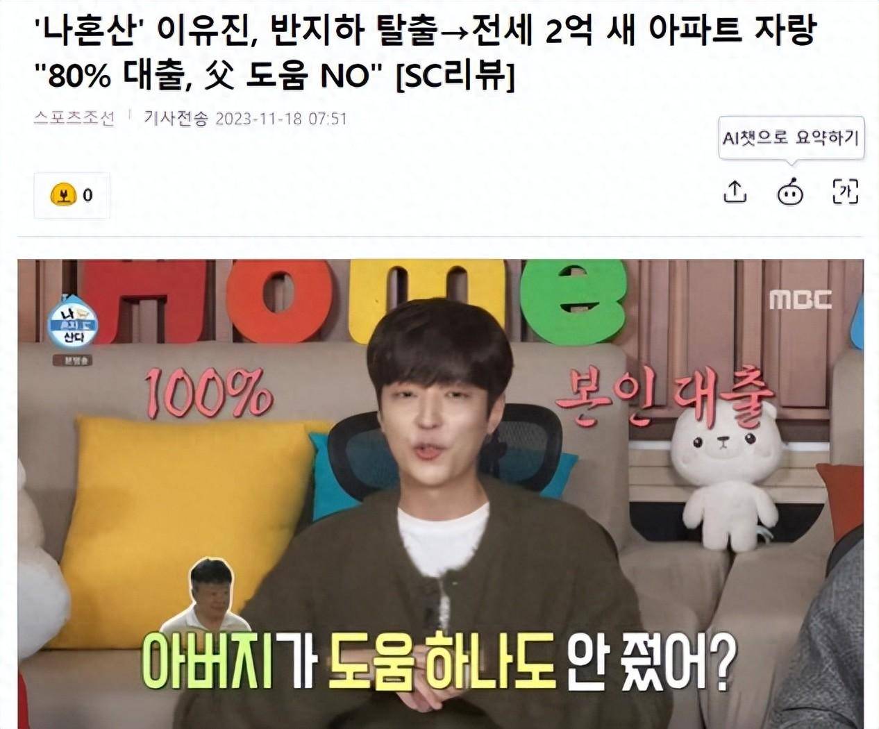 节目组成员全贤武提到了演员李孝正,问到“你父亲没有给你任何帮助吗?”,李宥珍回答说,是的,并表示,虽然我搬出了首尔,物价水平下降了,但我觉得知识就是力量。