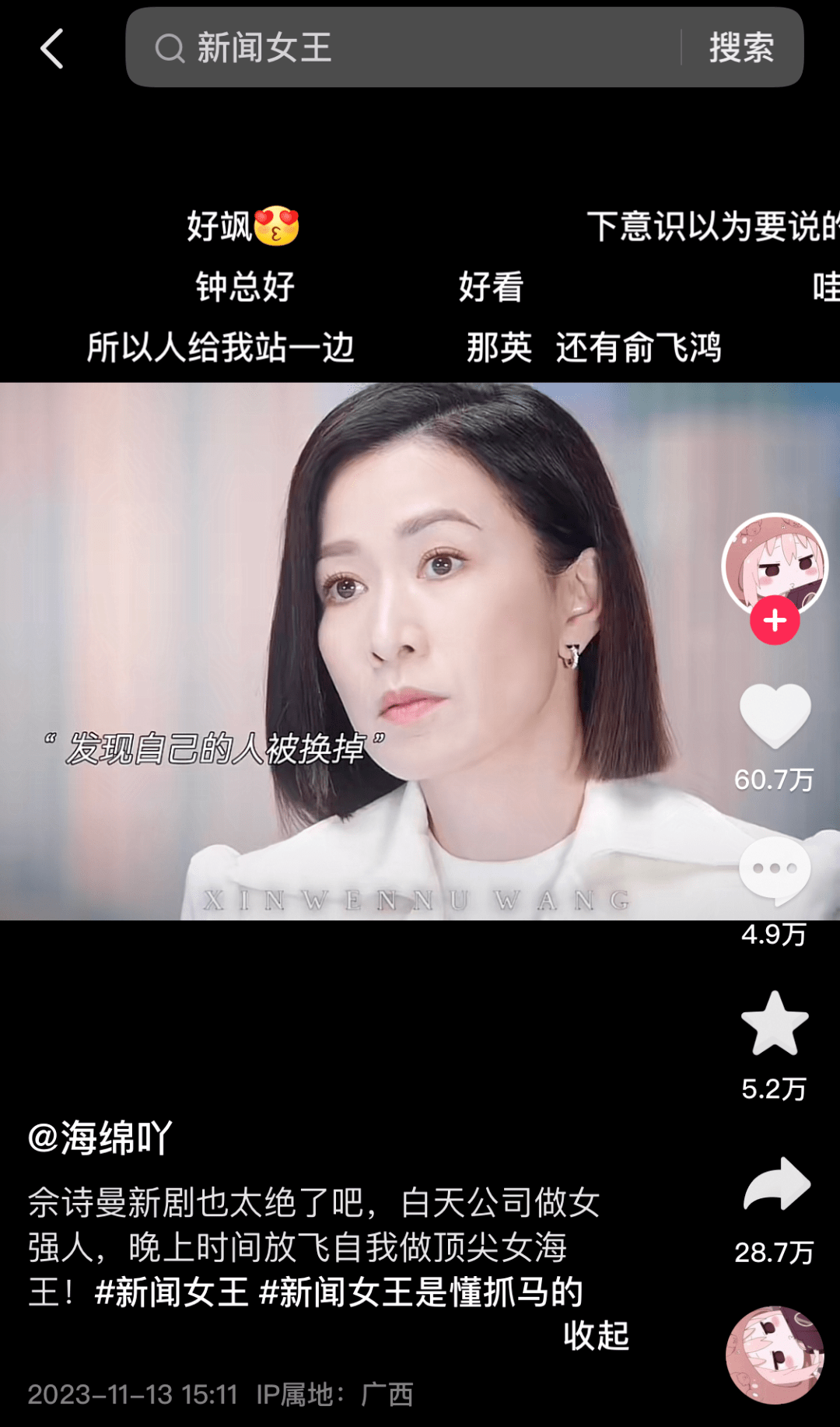 在抖音平台,二者的相关话题播放量均超2亿,其中《新闻女王》虽然未设置剧集官方账号,但通过优酷以及其他娱乐自媒体账号的推荐,表现最好的一条短视频7天累计点赞量已超60万。