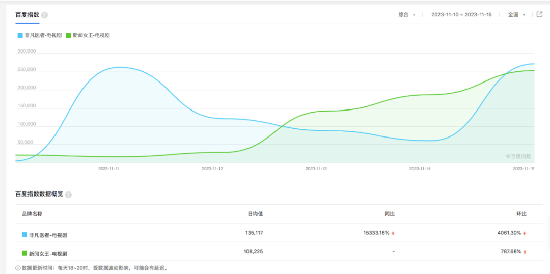 百度指数方面,从近一周的走势来看,二者的热度整体上均呈上升趋势,不过相较于《新闻女王》的平稳上扬,《非凡医者》的走势显得更加波动。总体来看,两部剧的热度在开播前基本处于势均力敌的状态,接下来就看播出后的网络反馈了。
