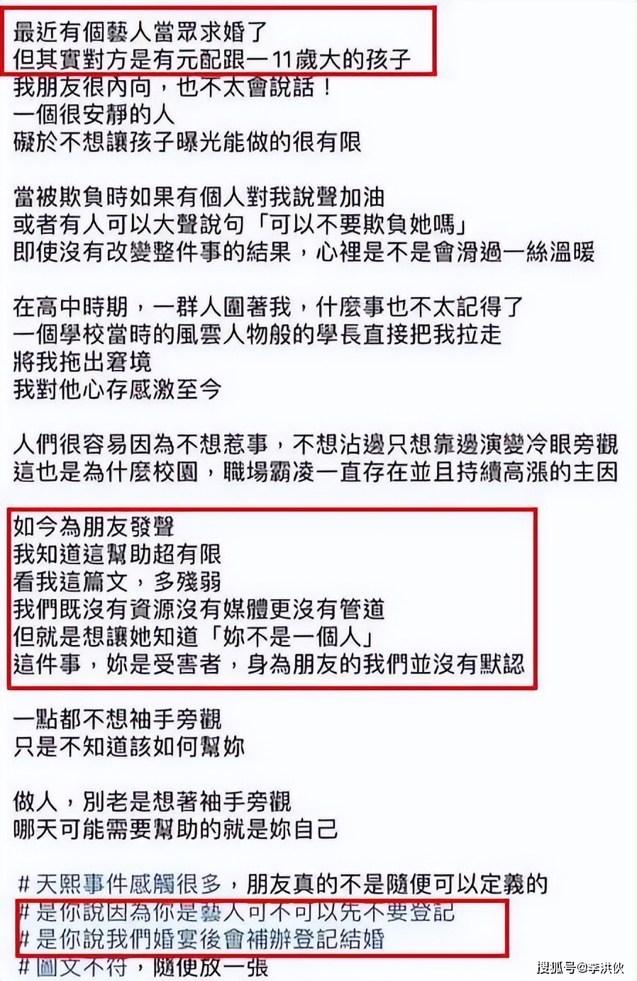 于是,在求婚后不久,社交平台上很快就有知情人士发声,称“近期求婚的艺人有一个十一岁的孩子。”并且“是你说因为你是艺人可不可以先不要登记。”“是你说我们婚宴后会补办登记结婚。”