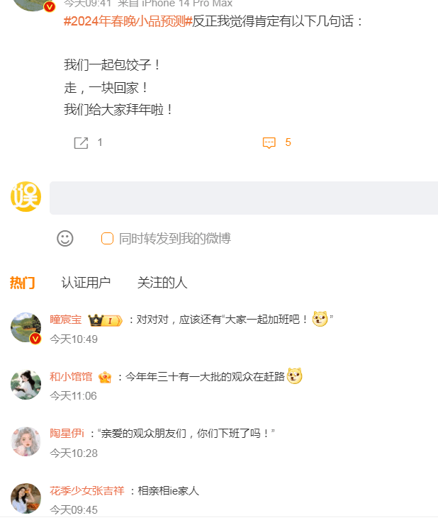 虽然距离春晚节目的几次彩排还很早,节目形式和内容也会最后才揭晓,但观众和网友对春晚的模式都相当熟悉,比如会有哪些节目品类,哪些明星很多人都能预测个大概,然后甚至对春晚小品下手进行预测。