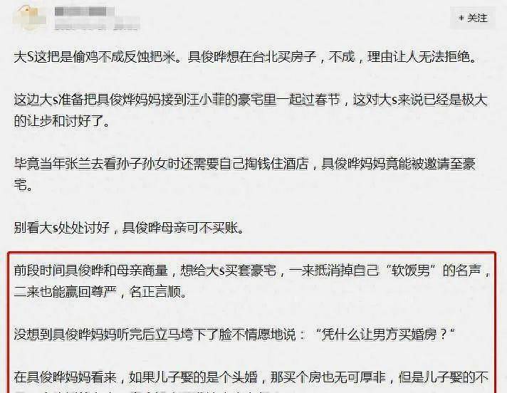 但似乎大S韩国婆婆对她并非那么喜爱,有爆料称婆婆嫌弃大S是二婚,因此拒绝具俊晔在台北买婚房的要求,看来具俊晔不但坐实了“软饭男”这一称呼,也坐实了“妈宝男”的称号啊。