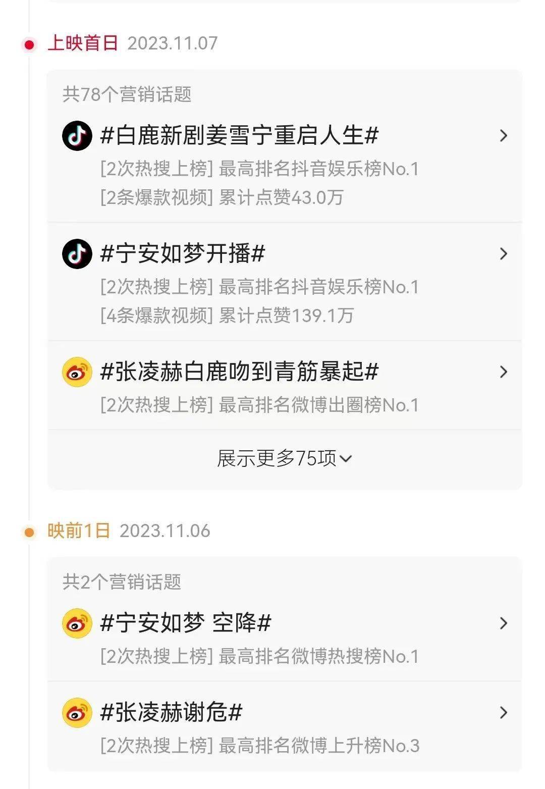 在《宁安如梦》播出首日,微博和抖音一共有78个热搜话题,其中抖音只有11个,明显看出其的营销主阵地在微博。微博的热搜主要集中于开播和演员身上,其中带白鹿名字的话题就超过了20个。