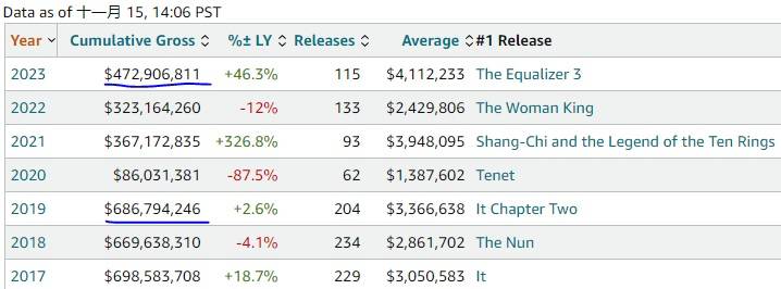 就电影行业来说,七八月暑期档因为《奥本海默》和《芭比》的大爆,票房较正常年份的2019年没有明显下滑,但到了九月、十月、十一月,市场明显走低,九月、十月北美电影票房较2019年同期分别下滑了31%、29%。