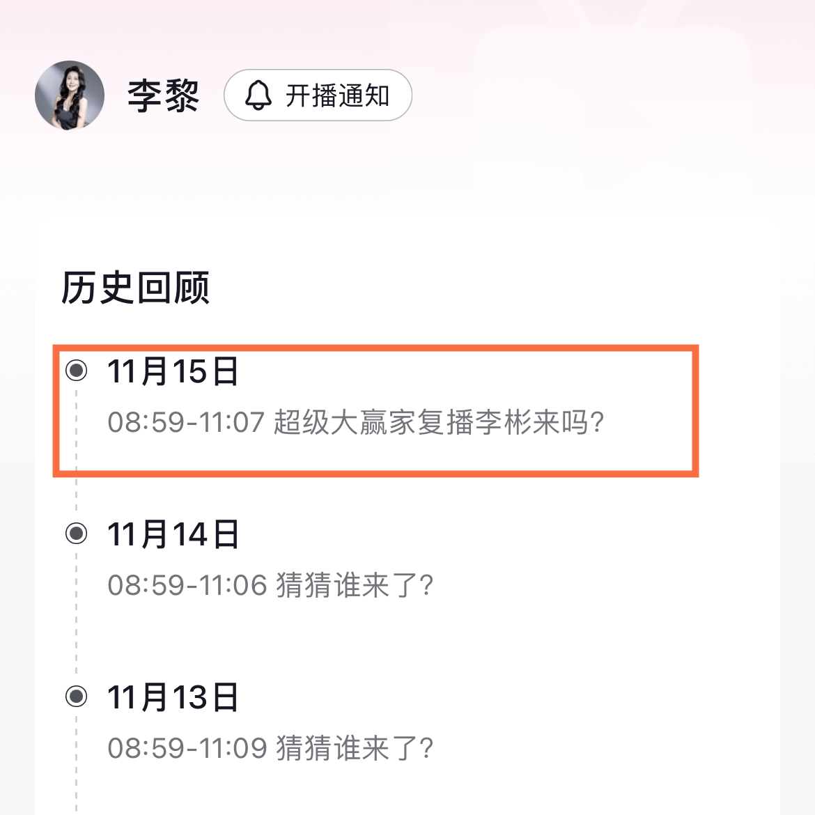 11月15号,主持人李莉于视频账号上开播,并以“超级大赢家复播李彬来吗”为标题,展开相关内容的叙述,其中主要包括李彬的身体状况以及一些细节的展示。