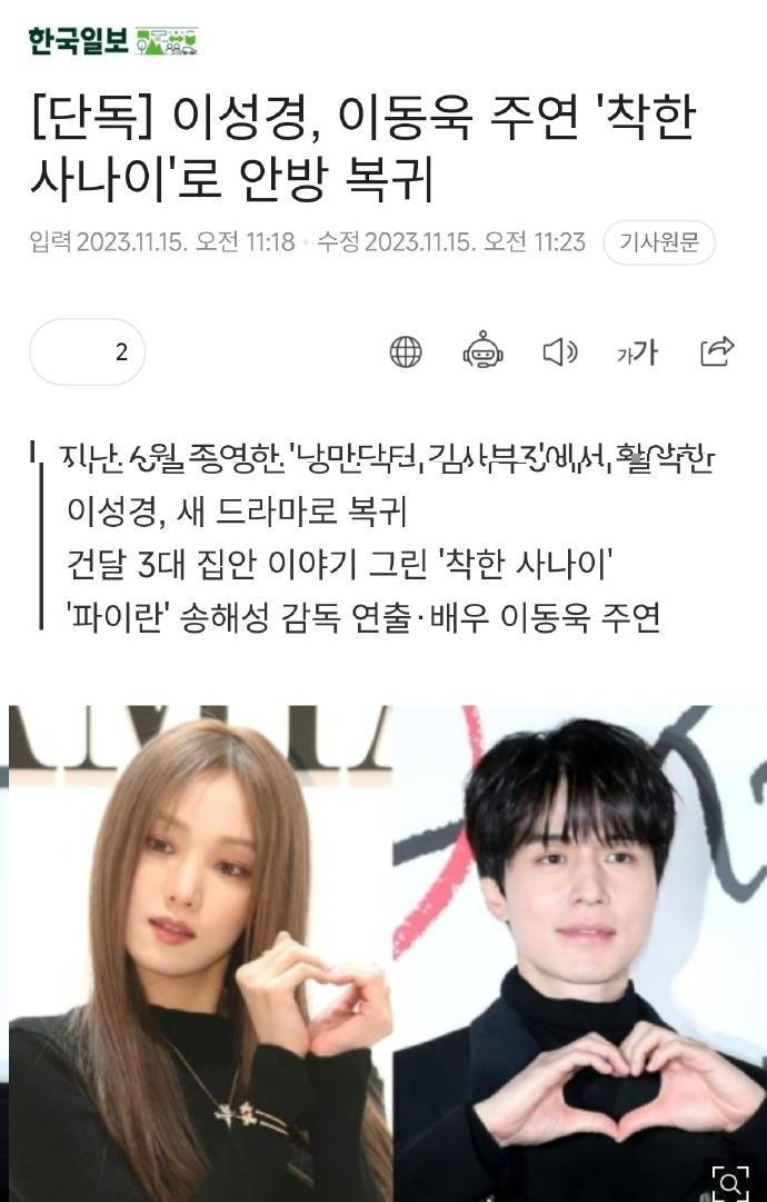 原标题:李晟京回归 将与李栋旭合作出演新剧善良的男子汉