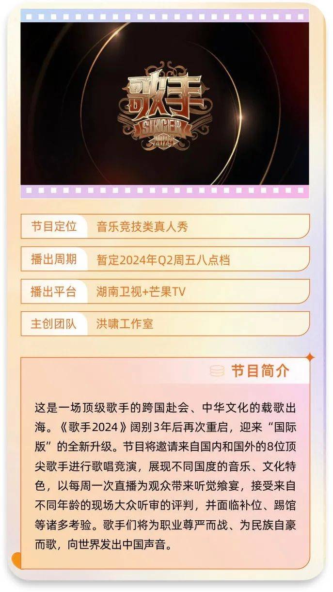 所以我们看到,这次招商会发布的很多综N代都与我们印象中有所不同。比如确认于明年归来的《歌手2024》,这季首次定位为“国际版”,播出形式首度尝试极其考验歌手唱功的“一周一直播”,在内娱音综领域是个很大胆的创举。