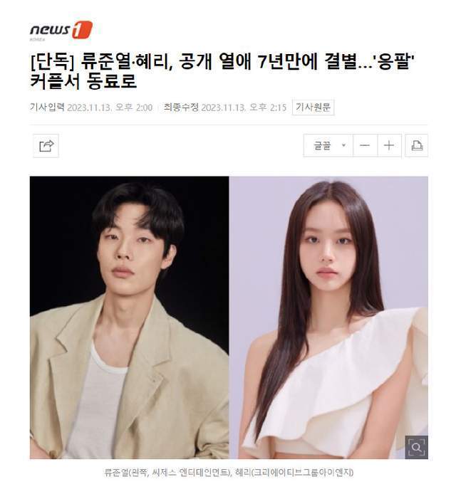 近日,韩媒爆料曾在《请回答1988》中出演高热度荧幕cp的柳俊烈和李惠利宣布和平分手,两人的七年爱情长跑告一段落。对于很多熟悉作品和艺人的观众来说,这曝出的分手消息不禁让人感到错愕,甚至让一些CP粉不愿相信。