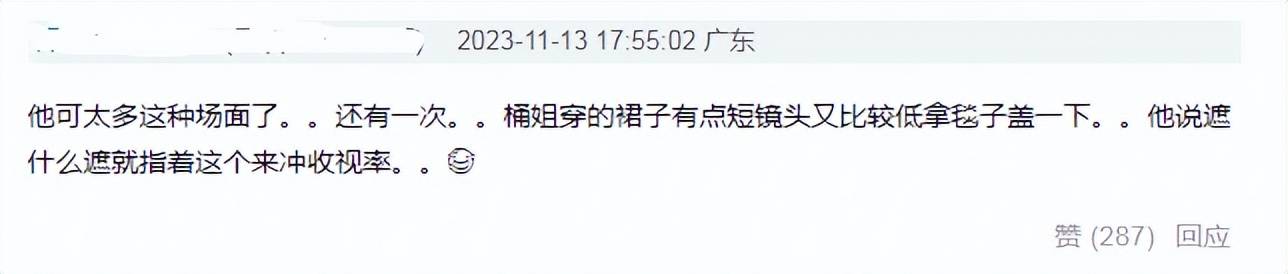 还有网友认为,沈腾一直以来国民度之所以还不错,是因为大家赋予他的喜剧人滤镜和他与马丽这一对cp带来的效应,实际上,这不是沈腾第一次有类似的言论。之前,在《王牌》的一次直播中,关晓彤穿的裙子有点短,为了防止走光,准备拿毯子盖一下,沈腾立刻阻拦并调侃:遮什么遮!就指着这个来冲收视率。当时这番话无人在意,加上贾玲接话活跃了气氛,化解了尴尬,可细细想来是否有不妥之处。