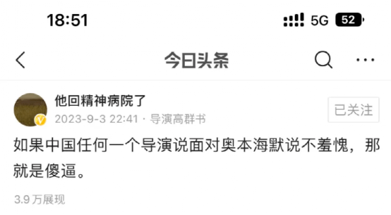 一个有趣的细节是,今年9月《奥本海默》上映期间,高群书发文评价中国导演面对《奥本海默》应该感到羞愧。