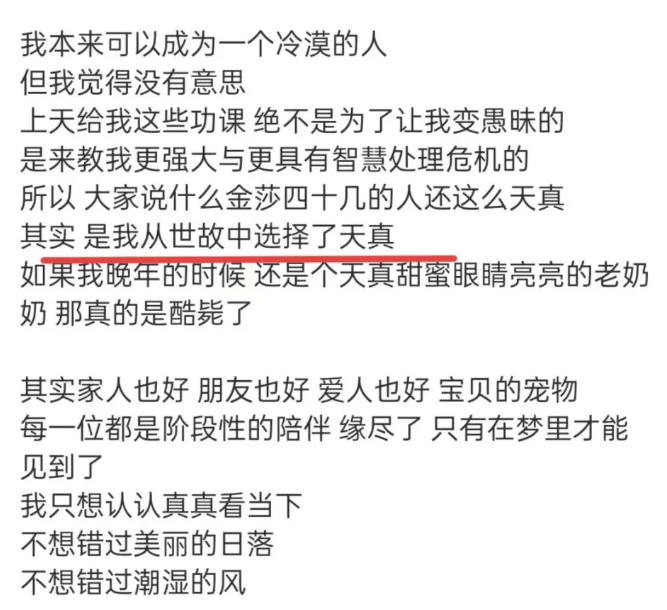 金莎还专门发长文回应有关自己恋情的许多争议,称四十多岁的自己是在世故中选择了天真,希望大家能对自己的小男友多点宽容,让人直呼她真是顶级“恋爱脑”。