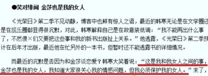 韩寒后来再被记者问烦了后,直接表示金莎是他的女人,当时的否认是为了保护她,而金莎却多年后在《浪姐》澄清,这是公司安排的炒作,是真是假也不得而知了。