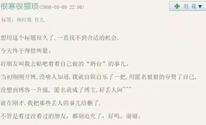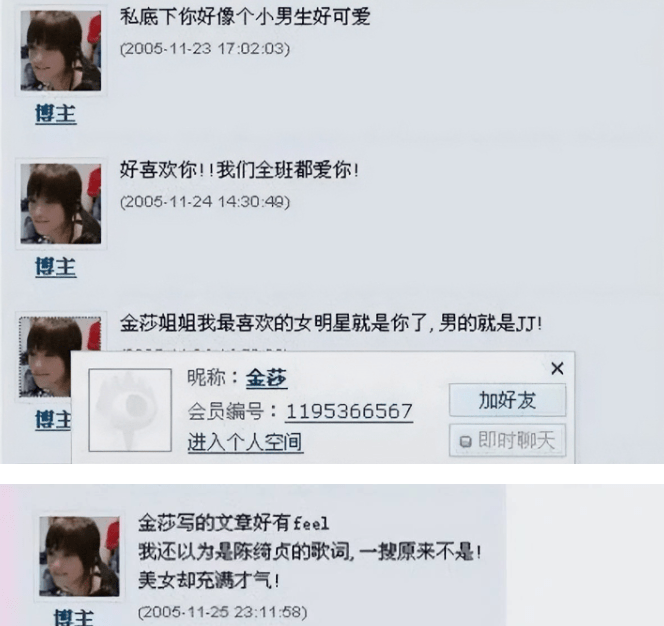 事实上,这种推测并不是没有道理的,2008年的“博客门”就让金莎彻底“社死”了,由于系统升级,之前的匿名评论都变成了实名,而金莎假扮粉丝,疯狂吹捧自己可爱、有才气,把“自恋”诠释得淋漓尽致。