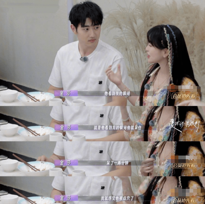 金莎在节目中讲述,在饭局中孙丞潇见到自己时,呆滞了一两分钟,透露出的意味是自己很有魅力,但惨遭何猷君实诚地拆台表示一两分钟真的很久。