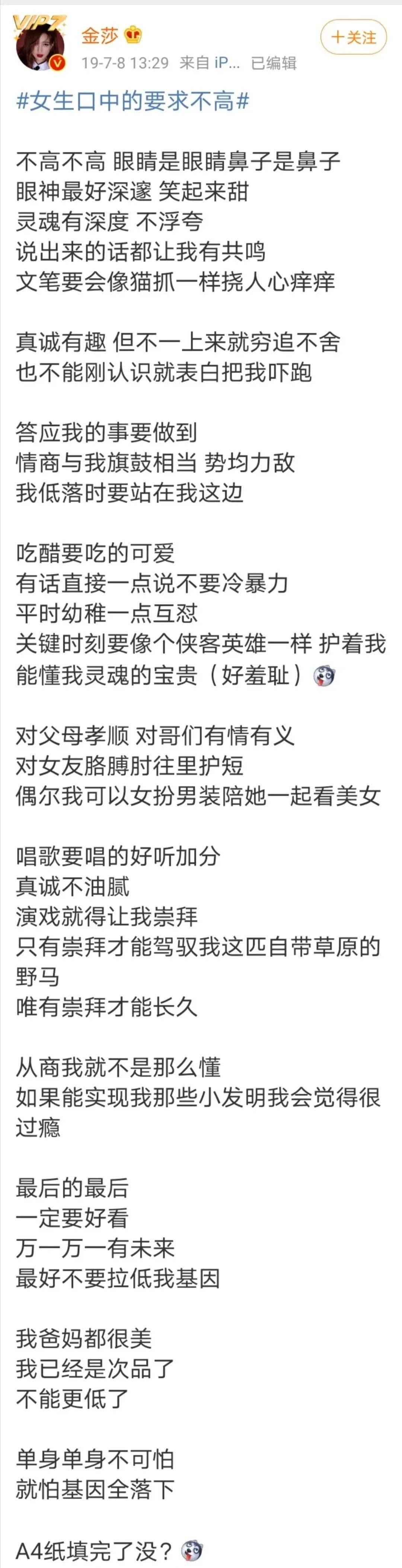 后来金莎还专门发文道歉,称自己当时只是自娱自乐,希望大家能忘记这件事。
