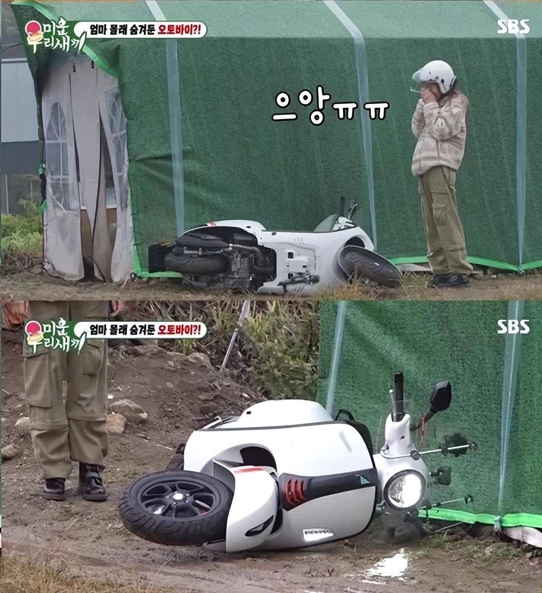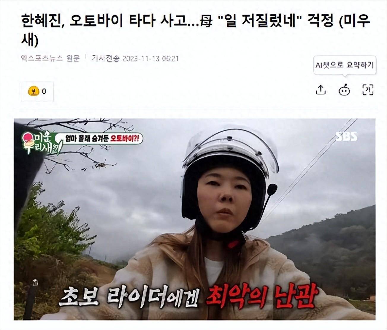 韩国女星,演员韩惠珍在综艺节目《我家的熊孩子》中,骑摩托车时发生了现场翻车事故。