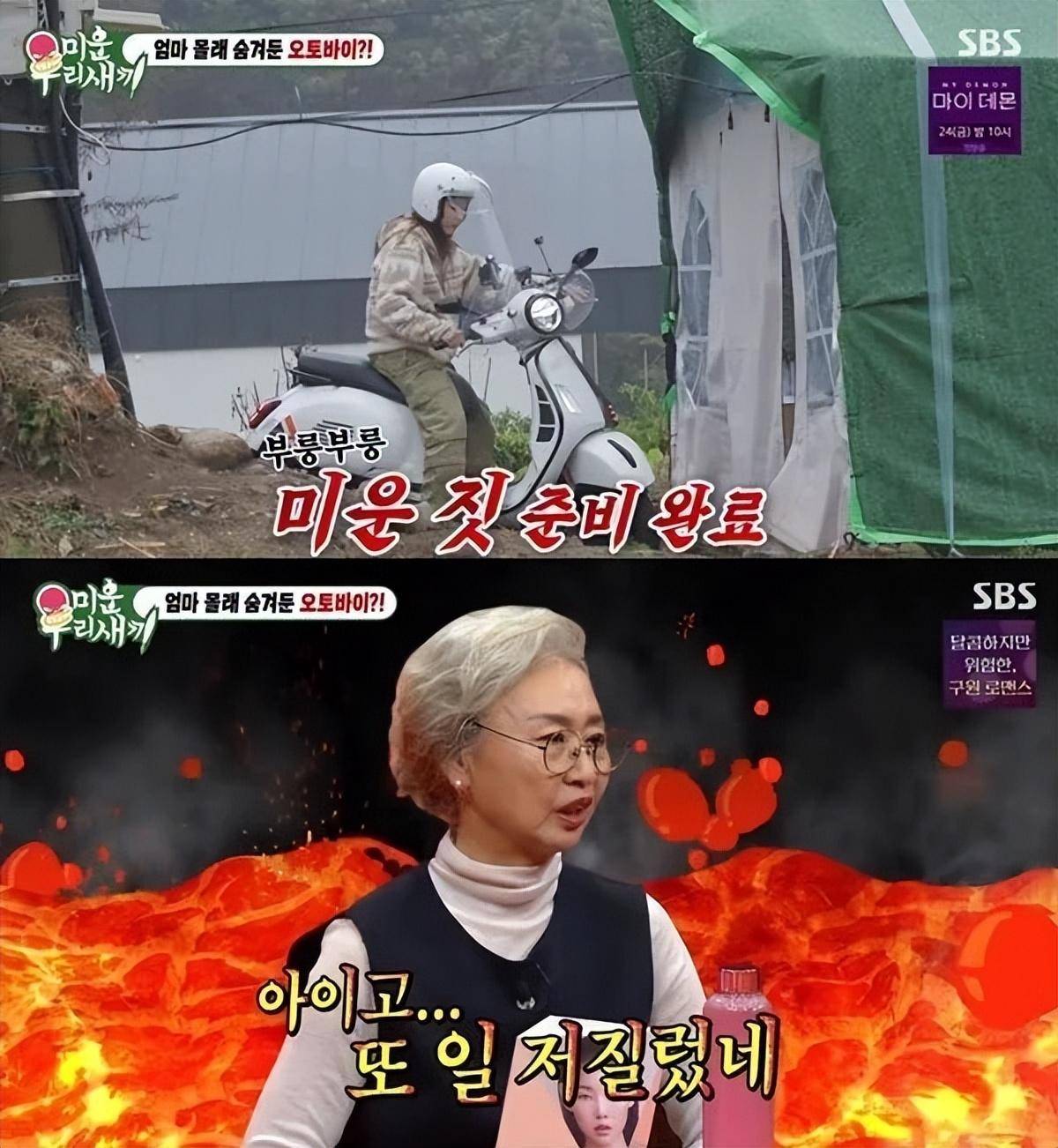 随后,韩惠珍从仓库里推出了一辆摩托车,韩惠珍的母亲被这危险的摩托车吓了一跳,并对她尝试骑摩托车表示担忧说:“你又这么做了”。