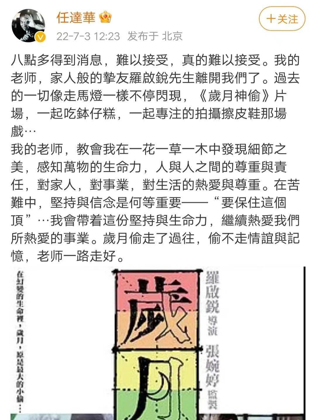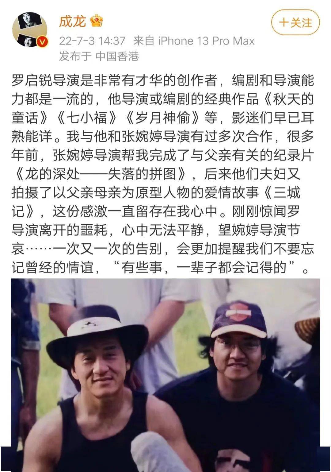 成龙在社交平台发文悼念:“罗启锐导演是非常有才华的创作者,编剧和导演能力都是一流的,他导演或编剧的经典作品《秋天的童话》《七小福》《岁月神偷》等,影迷们早已耳熟能详。我与他和张婉婷导演有过多次合作,很多年前,张婉婷导演帮我完成了与父亲有关的纪录片《龙的深处——失落的拼图》,后来他们夫妇又拍摄了以父亲母亲为原型人物的爱情故事《三城记》,这份感激一直留存在我心中。刚刚惊闻罗导演离开的噩耗,心中无法平静,望婉婷导演节哀……一次又一次的告别,会更加提醒我们不要忘记曾经的情谊,‘有些事,一辈子都会记得的’。”