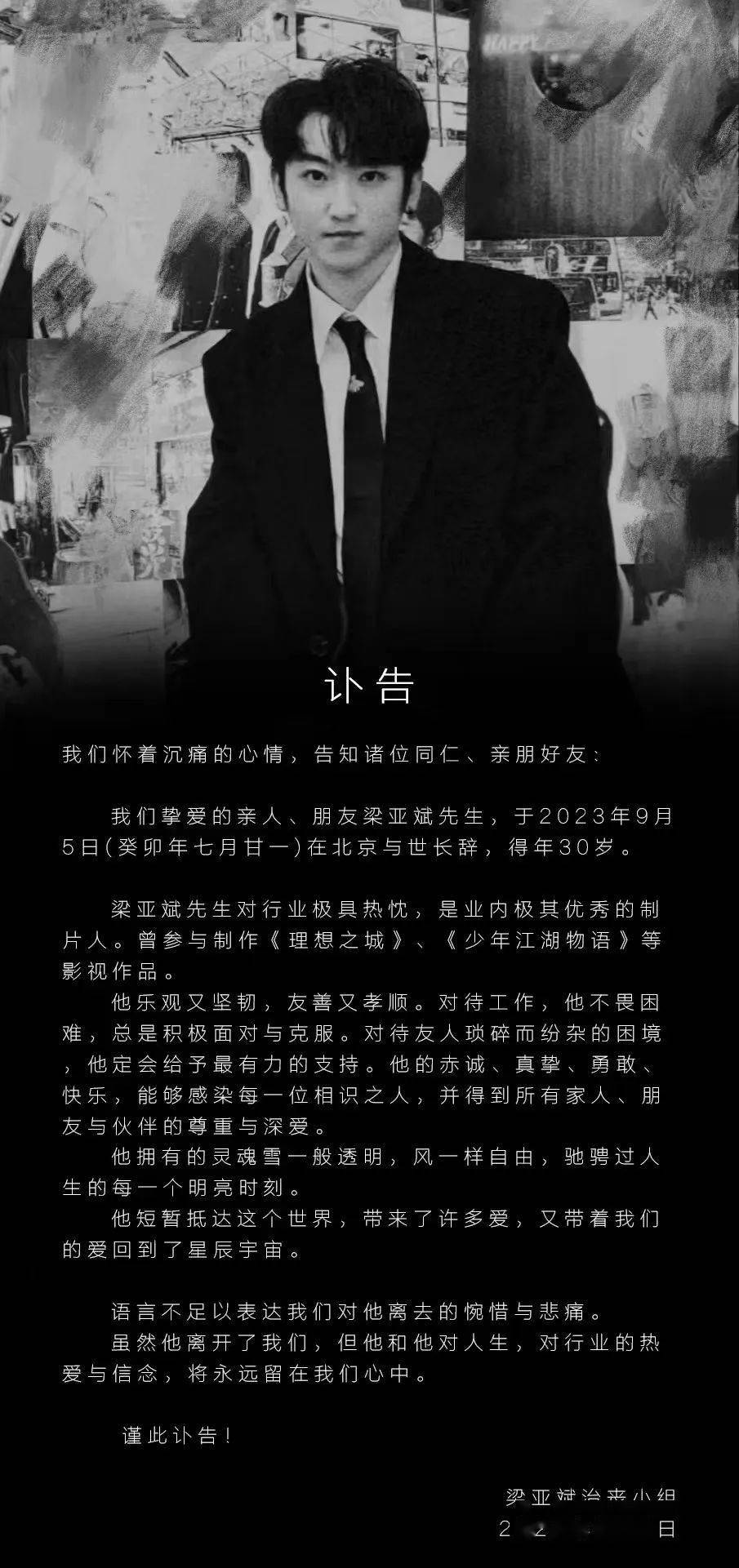 2023年9月6日,梁亚斌治丧小组发布讣告称,年仅30岁的青年制片人梁亚斌于9月5日在北京去世。