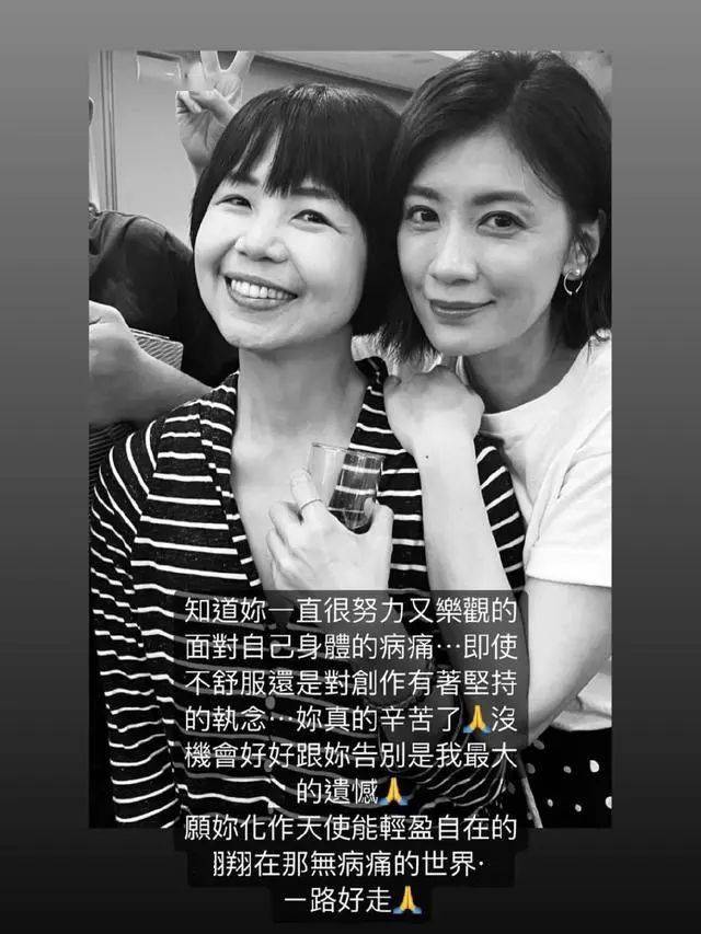 贾静雯是陈慧翎导演的作品《妈,别闹了》的主角之一,11月1日,贾静雯在社交平台上悼念陈慧翎:“愿你化作天使轻盈自在翱翔在无病痛的世界,一路走好”。