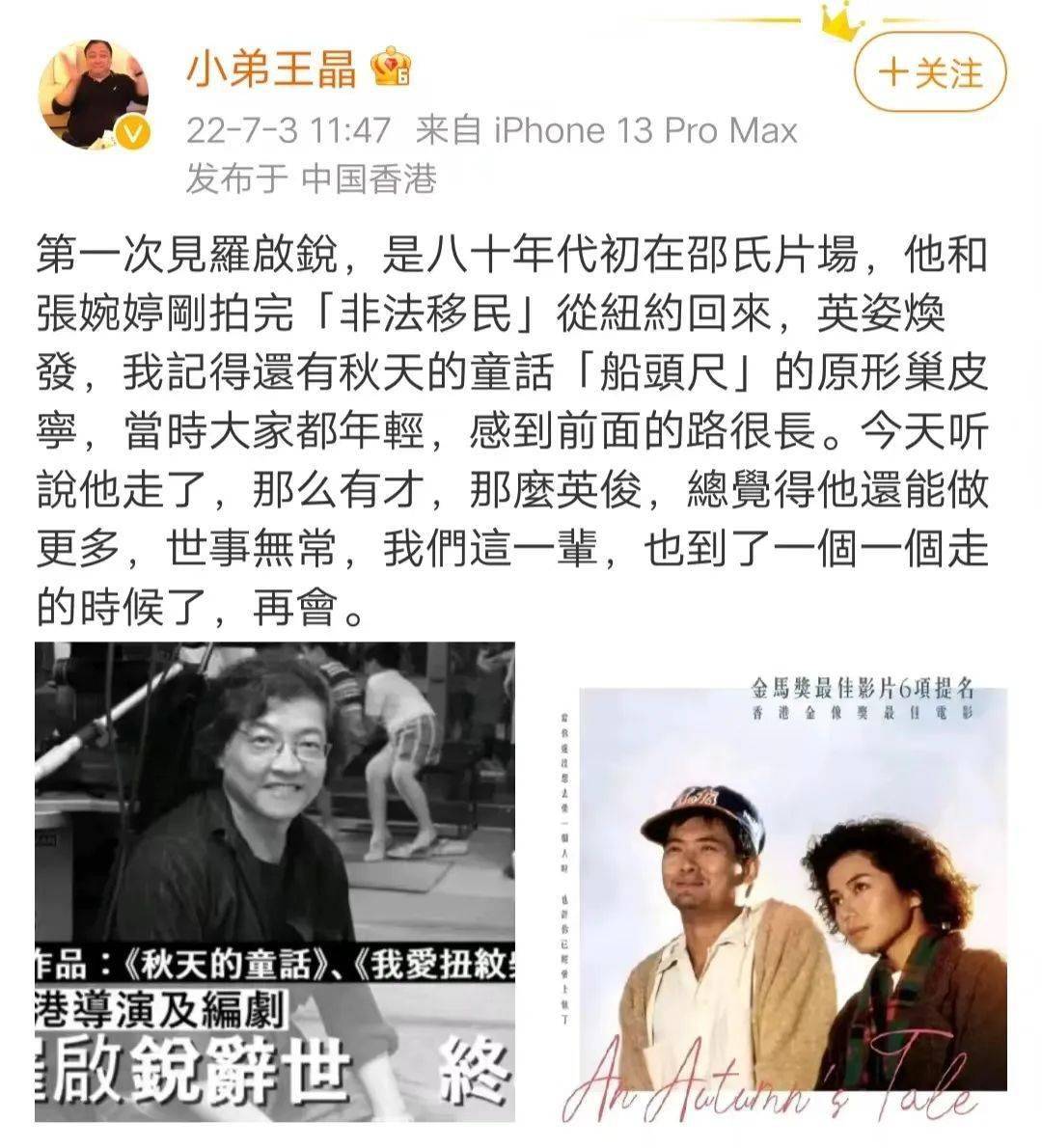 导演王晶也在微博发出自己对罗启锐的怀念之情:“第一次见罗启锐,是八十年代初在邵氏片场,他和张婉婷刚拍完《非法移民》从纽约回来,英姿焕发,我记得还有《秋天的童话》‘船头尺’的原形巢皮宁,当时大家都年轻,感到前面的路很长。今天听说他走了,那么有才,那么英俊,总觉得他还能做更多,世事无常,我们这一辈,也到了一个一个走的时候了,再会。”