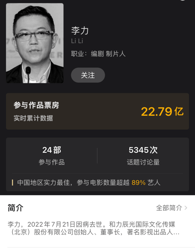 2022年7月21日,《冈仁波齐》、《小时代》系列电影、《北平无战事》等影视剧制片人、编剧、和力辰光董事长李力不幸辞世,享年52岁。