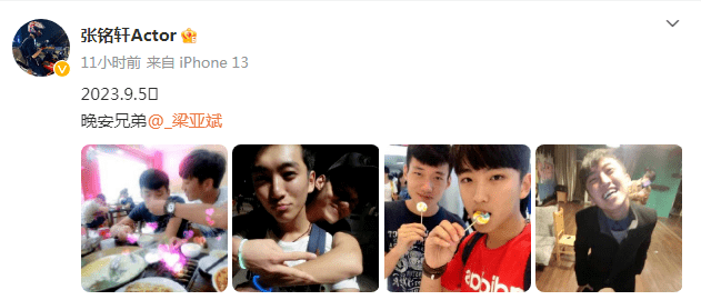 《一年一度喜剧大赛2》选手、演员,梁亚斌治丧小组成员张铭轩发布与梁亚斌的合影并写道:“2023.9.5,晚安兄弟”。