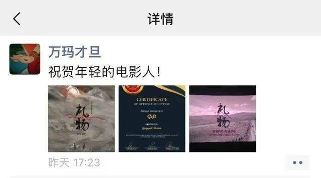 万玛才旦最新的朋友圈停留在5月7日17:23,配图三张格杰白玛导演的《礼物》海报,配文是“祝贺年轻的电影人”。