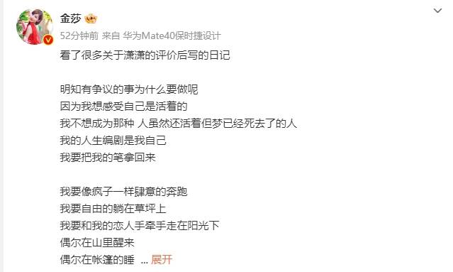 搜狐娱乐讯 11月11日,金莎发长文回应近期大家对于她的感情争议,希望大家能对社恐的男友孙丞潇友好一点,“明知有争议的事为什么要做呢?因为我想感受自己是活着的,我不想成为那种,人虽然还活着但梦已经死去了的人,我的人生编剧是我自己,我要把我的笔拿回来……当然,如果有不喜欢节目中我们这对情侣的,你们可以尽情说,因为这也是你们的自由,对不对,只希望对社恐的潇潇稍微友好一点点,不是说学表演的人就不可能社恐,再给一点点时间,和大家熟一些的状态,是不一样的,到时候或许会给你们惊喜的,恶语伤人六月寒……”