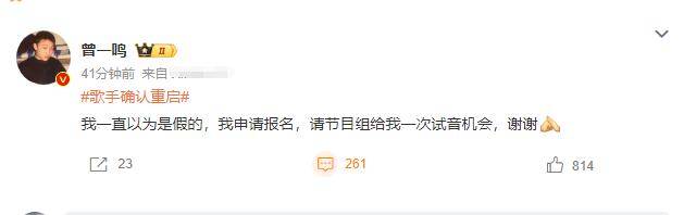 尽管早在10月底,就曾有知情人士曝光这一消息,但如今爆料被坐实,大家还是相当兴奋的,尤其是歌手的粉丝们已经开始在评论区为自家爱豆报名,而此前曾被《歌手》淘汰的歌手曾一鸣也瞬间上线,他先是调侃,之前一直以为这件事假的,随即开始提前为自己申请试音机会。