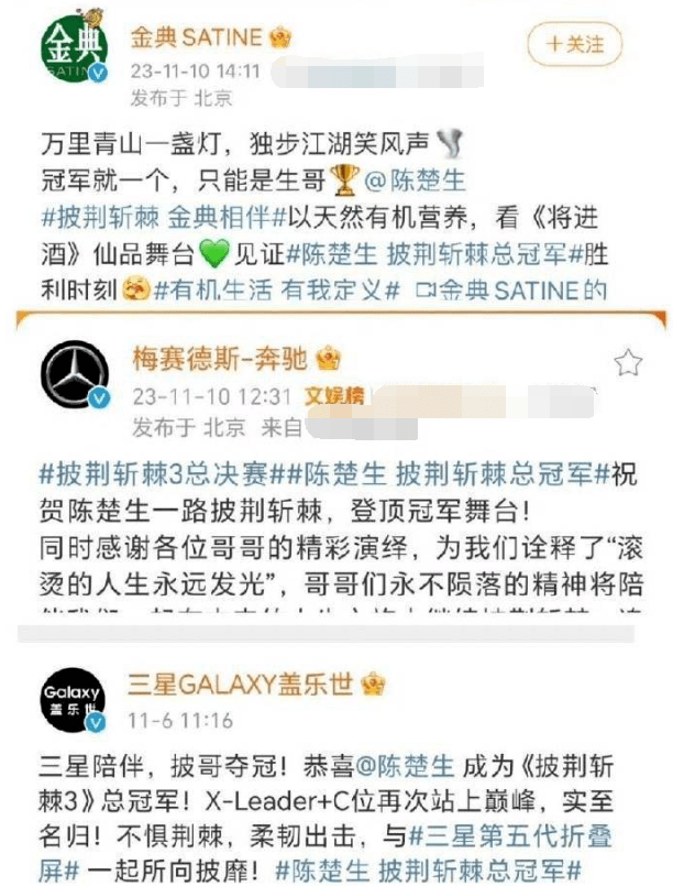 没想到热搜发酵后,大家对此热议纷纷,赞助商这些也在纷纷站队,赶忙发文祝贺总冠军陈楚生。