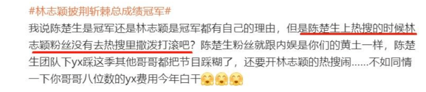 而林志颖的粉丝们则是认为陈楚生上热搜的时候,林志颖的粉丝并没有去评论区撒泼打滚。