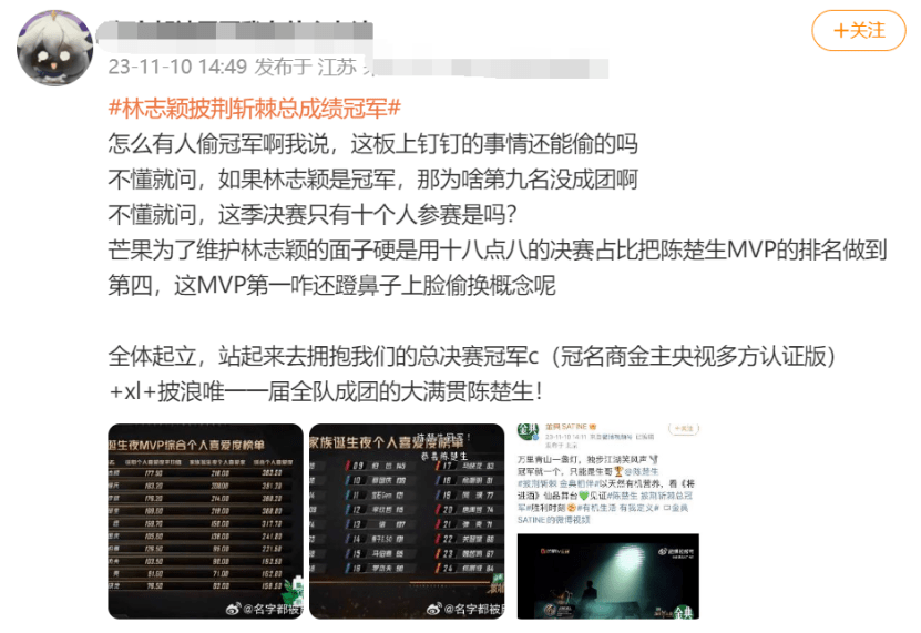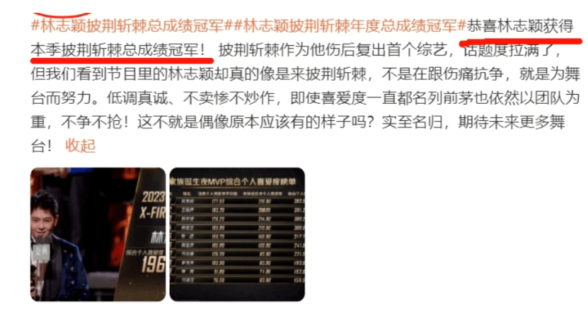 所以节目全程并未出现“披荆斩棘总成绩冠军”这个title,之后便被扒出这个热搜来源于某网络博主,他当时搞出这个所谓的“总成绩冠军”颁给林志颖,其实就是为了博眼球、炒话题,从而混淆了网友们的认知。
