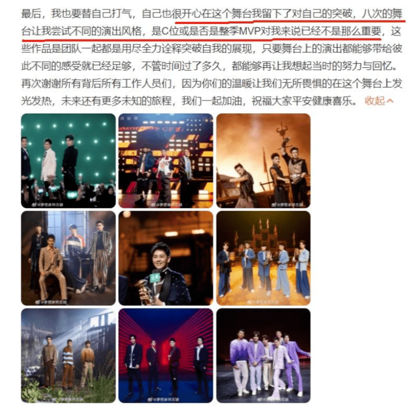 比赛结束后他也发文告别《披哥3》,表示“是C位或是否是整季MVP,对我来说已经不是那么重要”,最开心的是留下了自己的舞台突破。