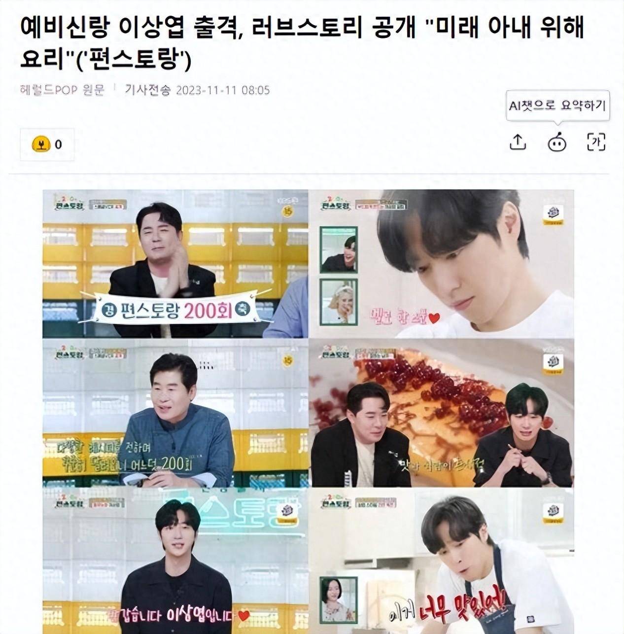 韩国知名男星,准新郎男演员李相烨,在综艺节目《新发布的Pyeon餐厅》第200期特别节目中首次亮相,李相烨展现了惊人的烹饪技巧。