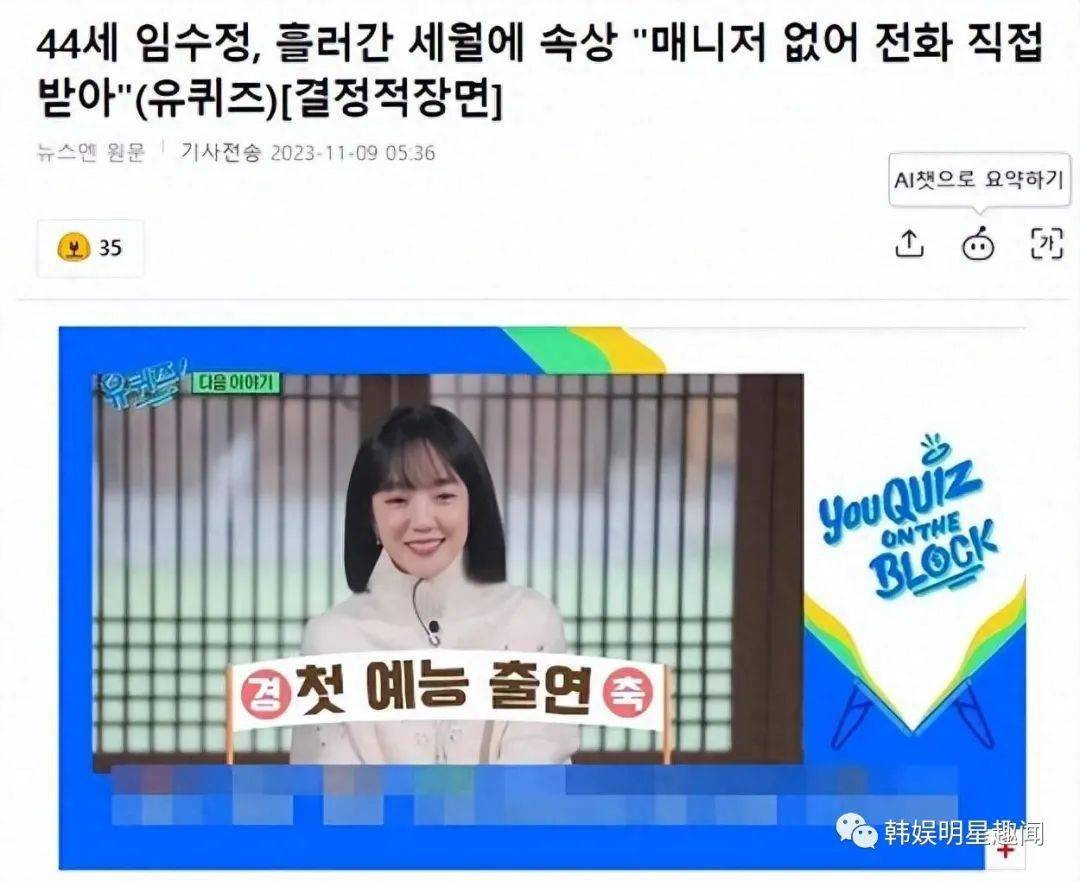 韩国女星,44岁演员林秀晶以率真的魅力备受瞩目。11月9日,有韩国媒体报道,8日播出的tvN综艺节目《You Quiz on the Block》第218集,最后宣布了演员林秀晶客串出演。