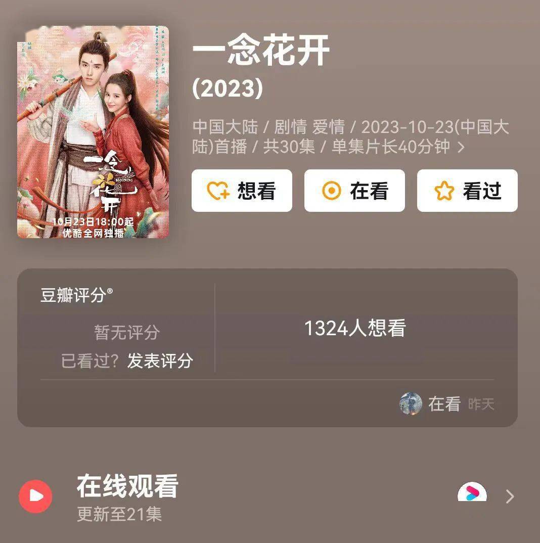 《一念花开》是一部古装奇幻甜宠剧,目前还没有出豆瓣评分。这部剧以清源剑派天才大师兄慕白携手修真界底层小师妹赵坦坦寻找天下至宝七叶梵莲为线索,他们一路互相整蛊,但也共同成长,最终收获爱情,并联手重振师门。